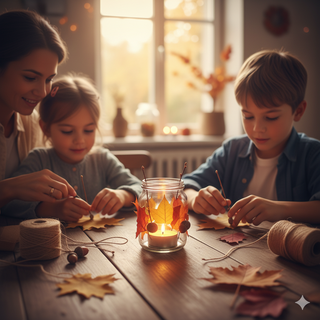 6. Création de bougeoirs d'automne : Fabriquer de jolis bougeoirs en décorant des pots en verre avec des feuilles, des glands, de la ficelle, pour une ambiance douce et chaleureuse.