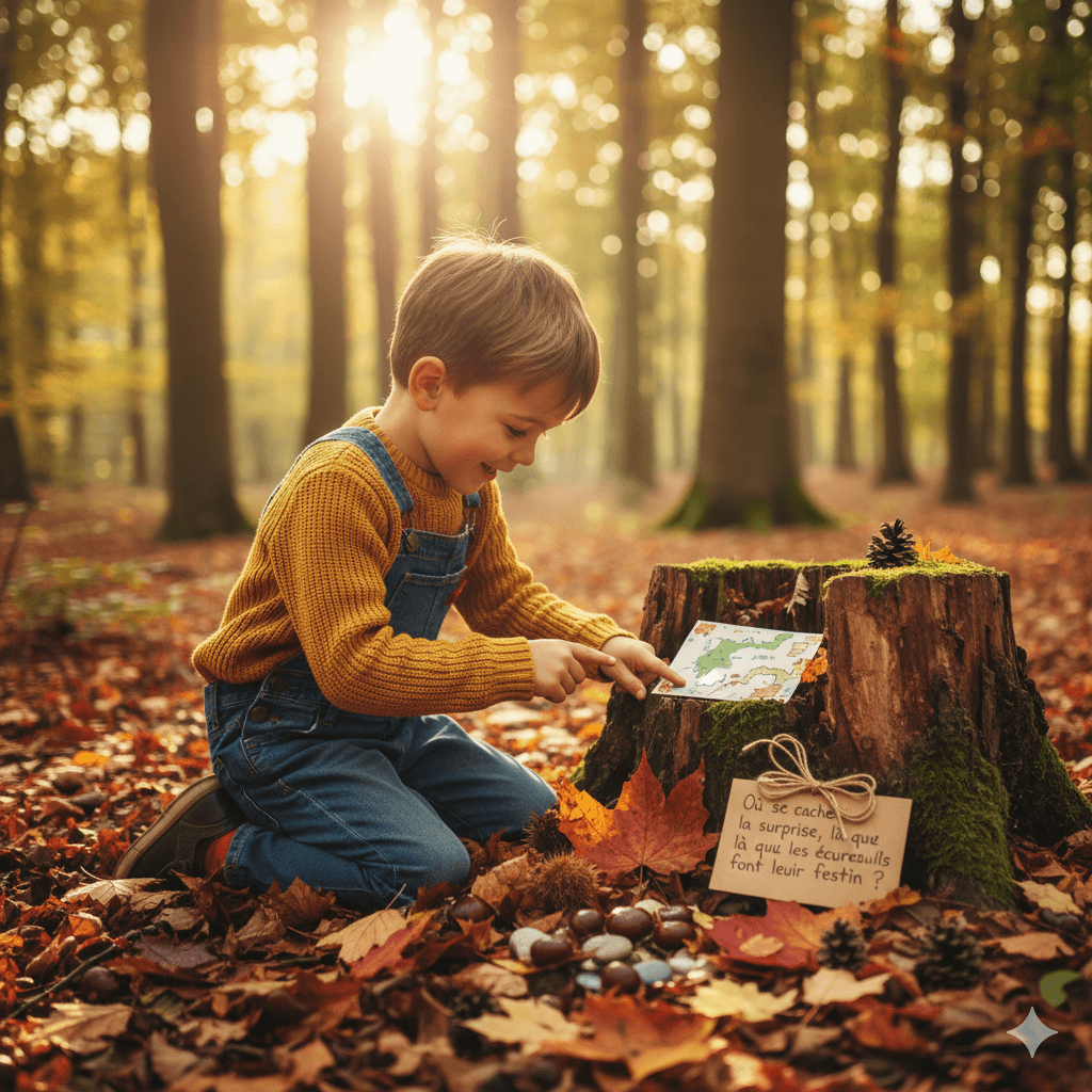 8. Chasse au trésor d'automne : Écrire de petites énigmes ou dessiner une carte menant à un "trésor" caché dans la maison ou le jardin, en lien avec les thèmes de l'automne.